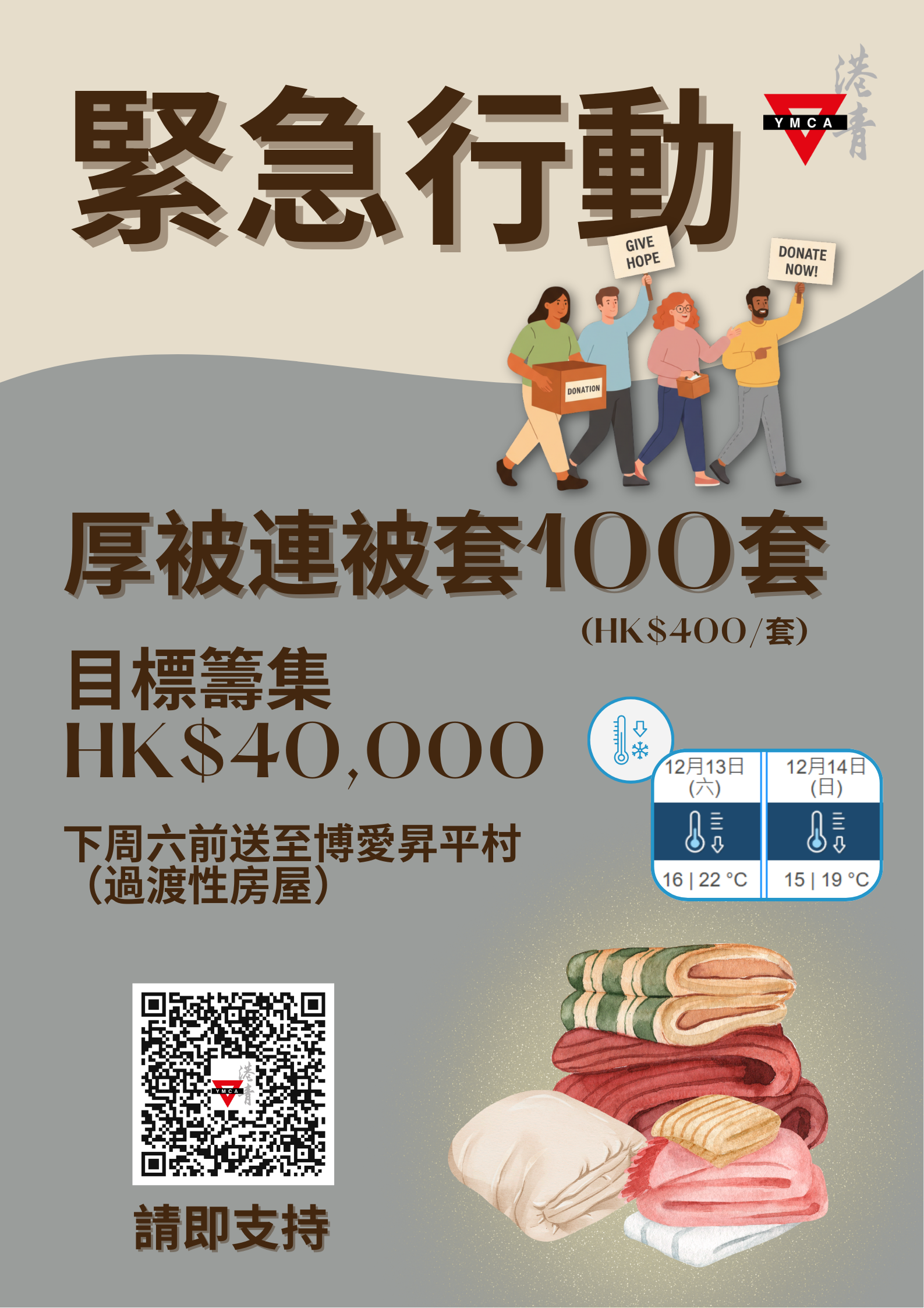 特別支援 – 送上厚被連被套共渡寒冬 Special Support – Providing Warm Blankets and Covers to Weather the Winter Together 香港基督教青年會與博愛昇平村過渡性房屋合作,期望於短期內籌款$40,000,於下周六(2025年12月13日) 本港天氣轉冷前,向居民送上送上厚被連被套100套,共渡寒冬。善款將用予購買厚被連被套,以及居民急需的小型家電與物資。另外港青Toy Reborn亦與合作伙伴發動捐出全新玩具,為有需兒童帶來愛與溫暖。 The YMCA of Hong Kong has partnered with Pok Oi Shing Ping Village Transitional Housing to raise HKD $40,000 in the near term. By next Saturday, December 13th, before the cold weather sets in in Hong Kong, we aim to deliver 100 sets of warm blankets with covers to residents, helping them through the winter. Donations will be used to purchase the blankets and covers, as well as small household appliances and other urgently needed supplies for the residents. In addition, YMCA Toy Reborn, together with its partners, is launching a donation drive for new toys to bring love and warmth to children in need.